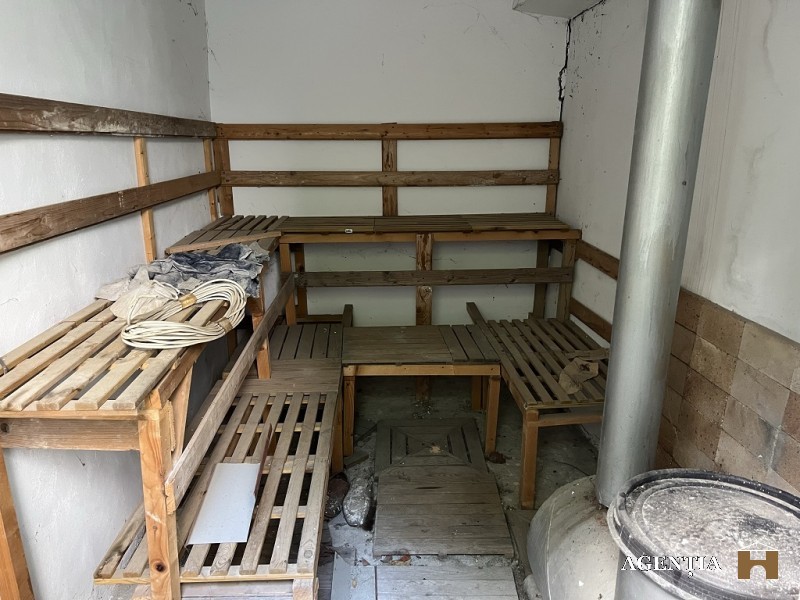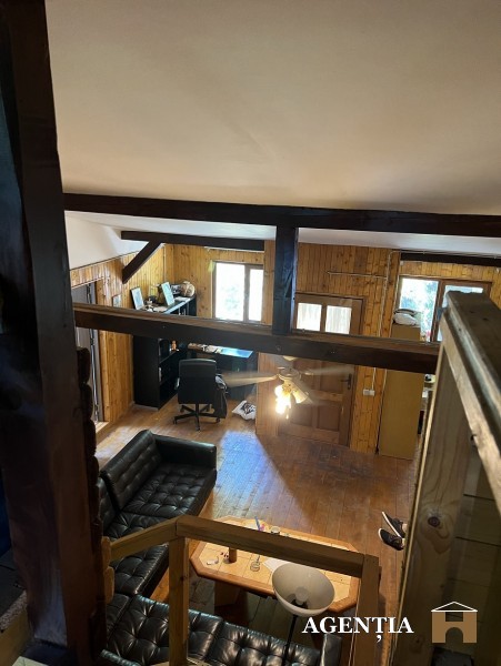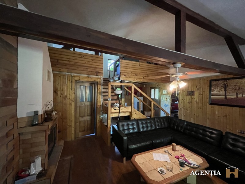 Din cladirea pe structura de lemn - stil maramuresean- de la etaj vederea este spre lac si in zona de living deschis se afla un semineu. In curte se afla si o piscina care trebuie renovata si o sauna ruseasca.